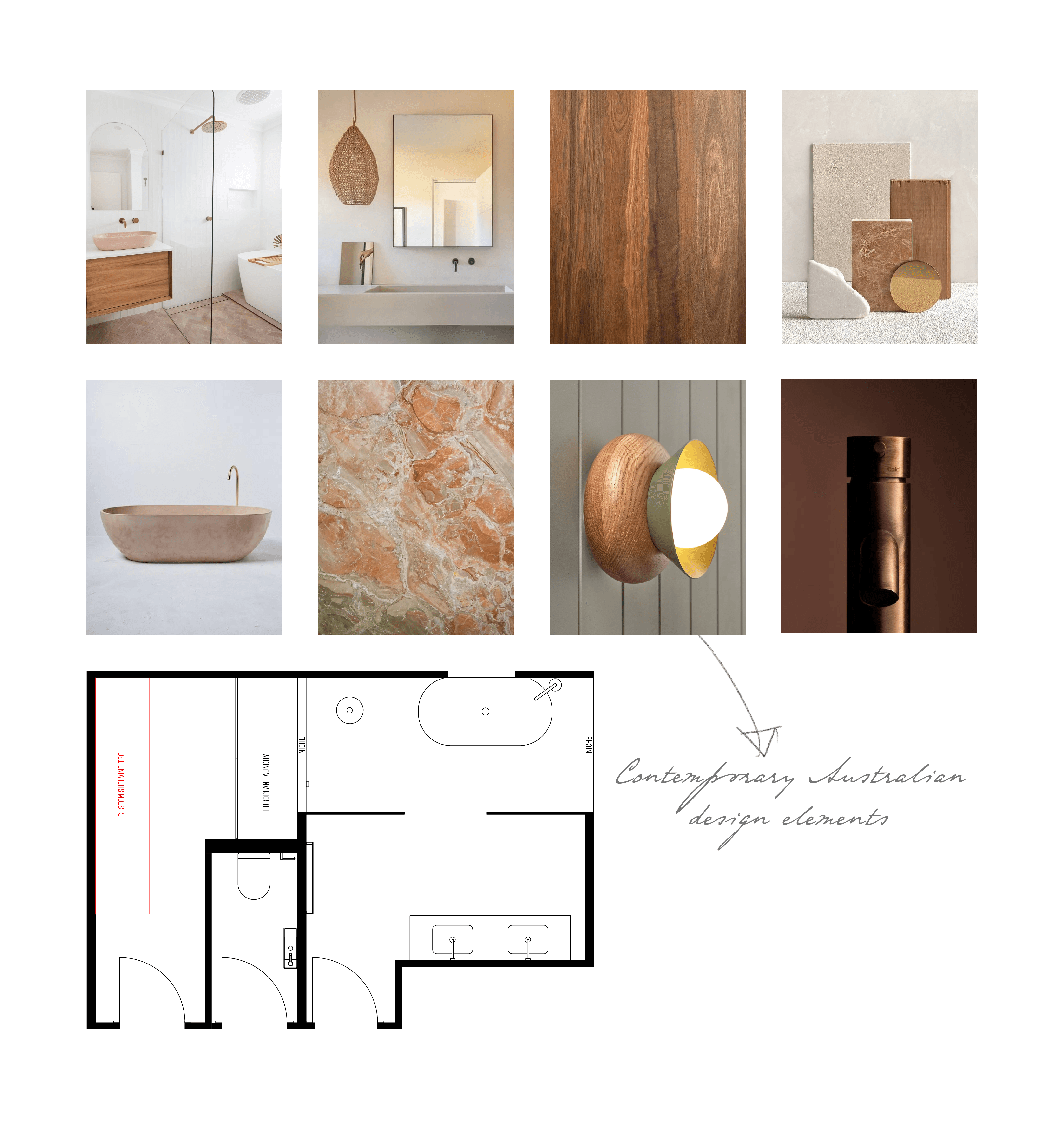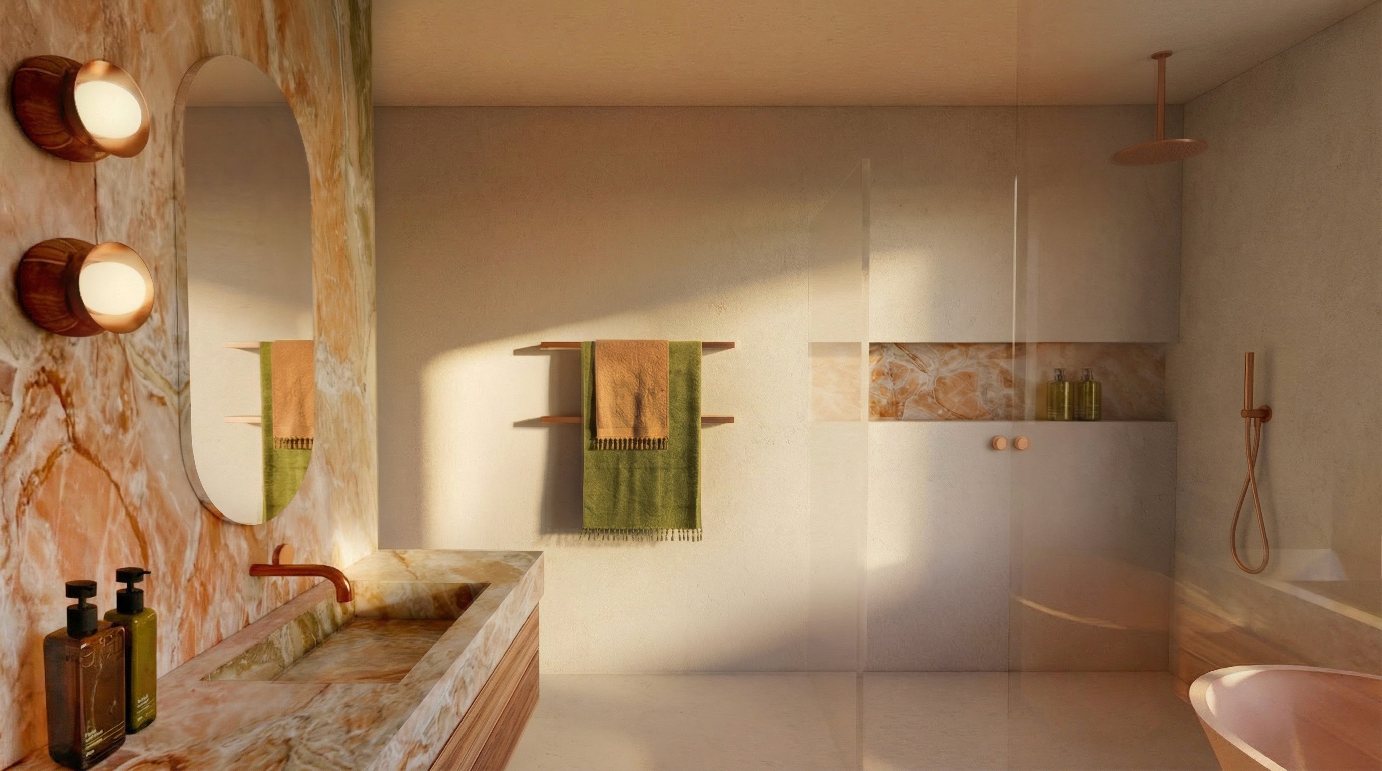 Breccia Damascata marble introduces natural pattern and colour through the vanity and recessed niches, while copper fittings subtly draw out the pink hues of the material palette. Australian-made elements bring further warmth, including a custom spotted gum vanity unit and handcrafted Sibling sconces by Fluxwood, whose timber detailing complements the natural material palette and modern styling of the space.